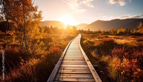 Panoramic autumn landscape with wooden path at sunset