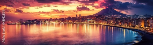 city landscape, sunset, water reflection, calm sea, colorful sky, city lights, mountain, coastline, urban, building, evening, panoramic, peaceful, vibrant, cloud, skyline, harbor, shore, twilight, dusk, scenic, landscape, city, waterfront, quiet, nature, serene, metropolis, architecture, urban life, travel destination, travel, sea, atmosphere, sky, horizon, calm, beautiful, scenic view, gloaming, natural beauty, water