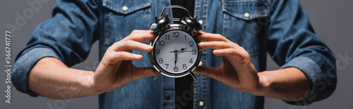 Panoramic crop of man holding alarm clock isolated on grey, concept of time management