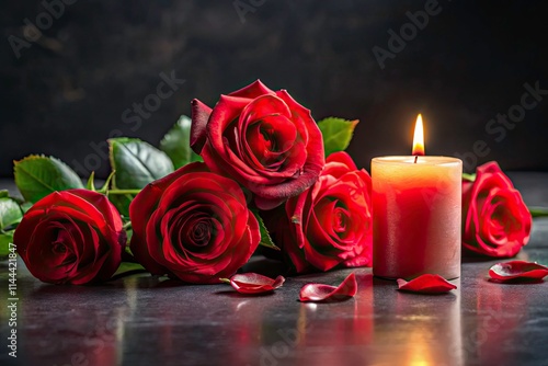 Panoramic Funeral Photography: Red Roses, Candle, Black Background - Elegant Memorial Image