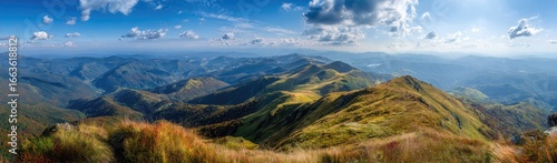 Panoramic mountain vista, expansive view of rolling hills and valleys, bathed in sunlight with a partly cloudy sky