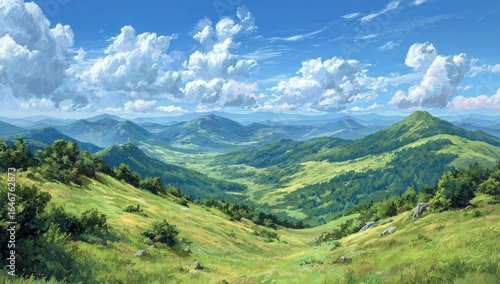 mountain, vale, landscape, vista, panoramic, sunny, green, hill, forest, cloud, sky, nature, scenic, meadow, grass, tree, elevation, high, view, summer, clear, bright, detail, colours, artistic, digital, paint, illustration, fresh, peaceful, expansive, breathtaking, idylli, viewpoint, perspective, rolling, forested, rocky, vegetation, flora, fauna, beauty