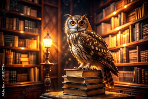 owl, library, book, panoramic, cosy, bird, reading, wisdom, cognition, education, vintage, antique, magical, mysterious, night, dark, wood, shelf, bookshelf, feather, animal, wildlife, photo, image, background, texture, illustration, design, art, nature, study, academic, intellectual, serene, calm, peaceful, atmosphere, ambient, old book, perched, sitting