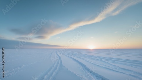 Panoramic perspective of the snow-covered field post-blizzard at sunset. Human tracks in fresh snow. Ice desert. Dramatic cloudscape. Global warming theme.