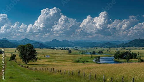 landscape, rural, field, river, mountain, cloud, sky, sunny, green, vale, horizon, grass, farmland, nature, scenic, panoramic, wide, open, tranquil, peaceful, summer, blue, white, vista, view, countryside, hill, tree, water, farmhouse, pasture, meadow, vegetation, elevation, distant, path, fence, calm, gold, gentle, picturesque, expansive, beautiful, photo