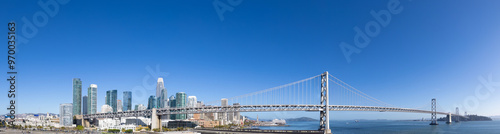 Panoramic San Francisco financial district skyline in city downtown with Oakland Bay Bridge.