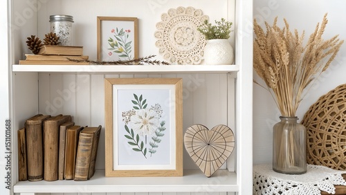 "Panoramic shelf styling with mockup print, dried florals, crochet doily, old books and wooden heart décor"