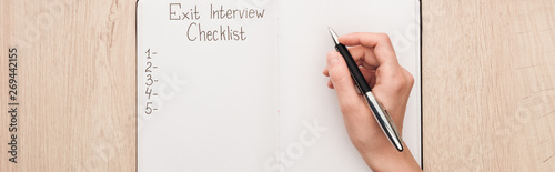 panoramic shot of recruiter writing in notebook with exit interview checklist lettering