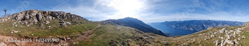 Panoramic shot of the landscape over the mountains and the blue sea from the peak on a sunny day
