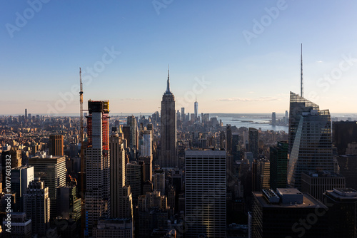 aerial, architecture, building, city, city landscape, downtown, dusk, highrise, horizon, landscape, long shot, manhattan, modern, new york city, panoramic, rooftop, sky, skyline, skyscraper, sunny, sunset, top, tower, urban, us, view, viewpoint