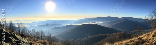 mountain, vale, sun, haze, mist, fog, panorama, landscape, scenic, view, rock, brush, tree, sky, blue, horizon, dawn, dusk, light, bright, serene, peaceful, tranquil, majestic, expansive, huge, wilderness, nature, autumn, winter, cold, elevation, height, distance, perspective, beauty, wonder, awe, aethereal, sublime, craggy, range, peak, summit