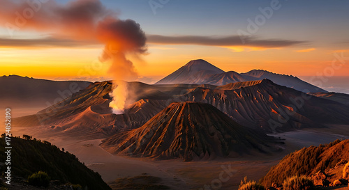 Panoramic Sunrise over Volcanic Mountains with Smoke Plumes