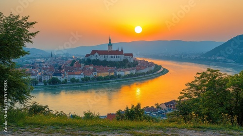 sunrise, sunset, river, town, city landscape, mediaeval, cathedral, church, city, europa, travel, tour tourism, scenic, landscape, panorama, view, gold, light, historic, architecture, vacation, beautiful, amazing, nature, photo, landmark, explore, charming, dramatic, photo