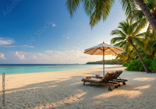 Panoramic tropical beach landscape for background or wallpaper, two lounge chairs with umbrella