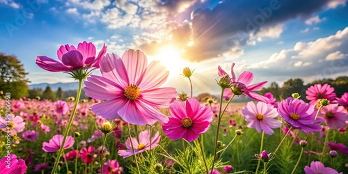 Panoramic UHD view of a breathtaking pink cosmos flower garden, a stunning summer floral photography masterpiece.