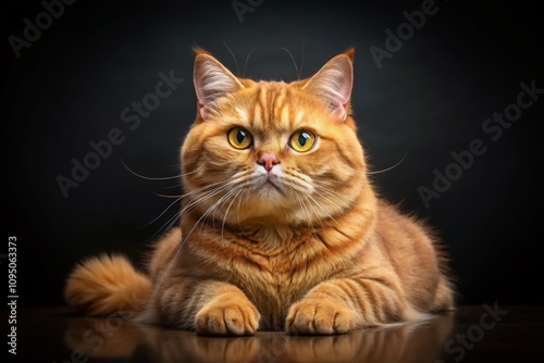 Panoramic View of a British Cat with Luxurious Red Fur Relaxing on a Solid Black Background, Capturing the Beauty and Elegance of This Feline in a Striking Composition