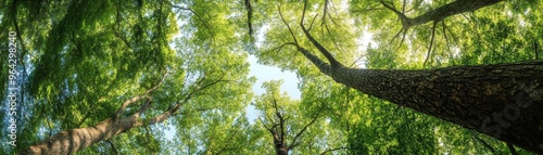 Panoramic view of a lush green forest canopy, with tall trees and sunlight filtering through, creating a serene and beautiful natural scene.