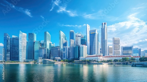 Panoramic view of a modern city skyline on a sunny day, reflected in calm water.