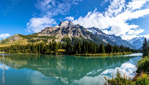 mountain, lake, sky, cloud, tree, forest, water, landscape, nature, scenic, beautiful, pristine, calm, tranquil, sunny, outdoors, green, blue, panorama, peak, wilderness, alpine, summer, crisp, high-coloured, clear, majestic, huge