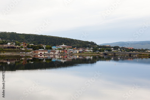 Panoramic view of a small town and its reflection in a body of water during a grey morning, Gaspé, Quebec, Canada