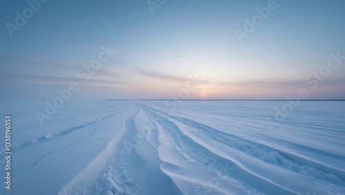 Panoramic view of a snow-covered field following a blizzard at sunset. Human footprints in fresh snow. Ice desert. Dramatic cloud formation. Global warming theme.