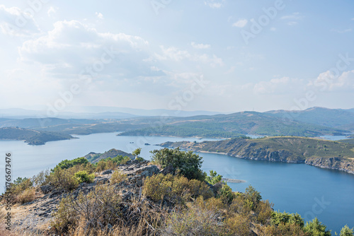 reservoir, dam, water, lake, mountain, hill, peak, ridge, vale, landscape, nature, scenery, spanish, spain, madrid, sierra, blue, green, calm, serene, peaceful, tranquil, huge, expansive, deep, clear, shoreline, rock, cliff, rugged, pine, forest, tree, sky, cloud, sunset, sunrise, summer, autumn, panoramic, aerial, drone, wilderness, remote, hiking, trail