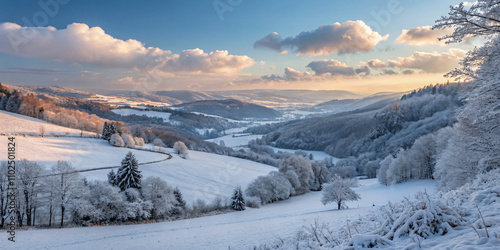 panoramic view of a winter valley blanketed in fresh snow under soft morning light