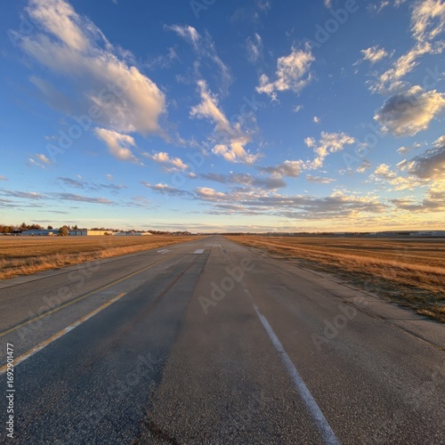 runway, airfield, sunset, sky, cloud, horizon, road, asphalt, plain, rural, empty, wide, long, panoramic, perspective, daylight, gold, light, landscape, nature, travel, transportation, aerodrome, taxiway, marking, line, weather, calm, peaceful, golden hour, aviation, grass, field, building, far, distant, clearing, open, still, brown, winter, calmness, serenity, expansive, wide open, pavement, horizontal, clear