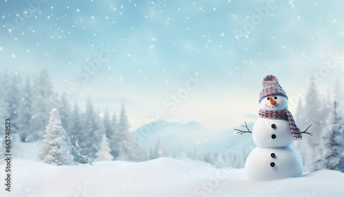 panoramic view of happy snowman in winter