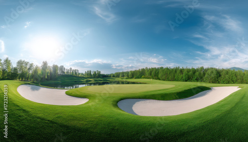 Panoramic view of lush golf course with green fairway, sand bunkers, and tranquil pond surrounded by trees under bright blue sky with sunlight
