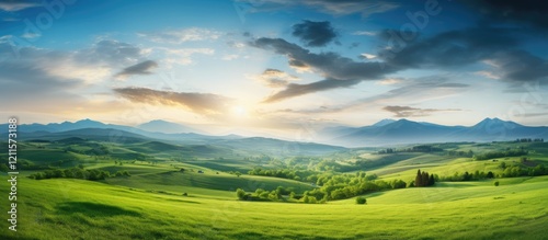 Panoramic view of lush green hills under a blue sky with clouds at sunrise; vibrant colors create a tranquil and serene landscape scene.