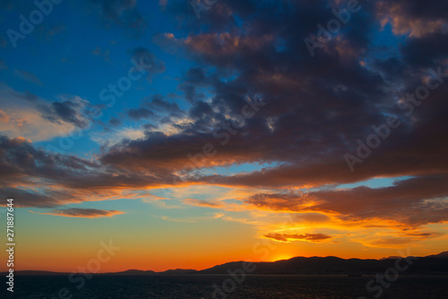 Panoramic view of Mediterranean sea, sky with dramatic clouds at golden sunset in Palma de Mallorca, Spain.
