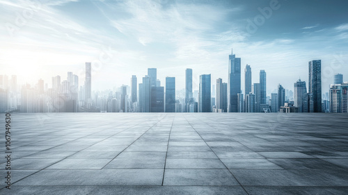 panoramic view of modern city skyline featuring tall skyscrapers under clear blue sky. scene conveys sense of tranquility and urban sophistication, perfect for various design projects