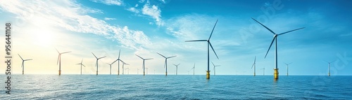 Panoramic View of Offshore Wind Farm with Turbines Generating Renewable Energy in the Ocean at Sunset