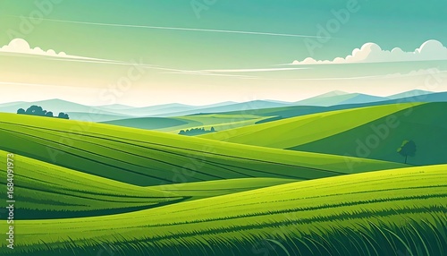 panoramic, landscape, hill, green, vale, field, meadow, summer, nature, cloud, sky, horizon, smooth, pastel, light, sun, daylight, peaceful, rural, countryside, view, wide, open, grass, texture, illustration, digital, art, design, vibrant, colours, gentle, slope, mountain, background, style, vector, calm, serene, idylli, beautiful, quiet, expansive, fresh, soft