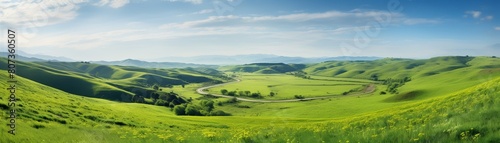 Panoramic view of rolling green hills, scattered wildflowers, bright day