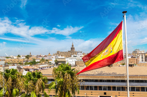 spain, seville, flag, symbol, view, aerial, andalusia, cathedral, seville, city, city landscape, architecture, europa, tower, travel, spanish, tour tourism, town, church, urban, old, landmark, building, famous, culture, day, summer, sky, up high, panorama, panoramic, horizon, european, skyline, scenic, street, roof, house, exterior, heritage, unesco, scene, background, history, historic, landscape, place, downtown