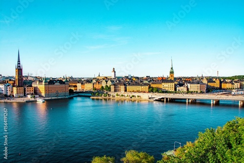 stockholm, sweden, city landscape, skyline, water, architecture, building, colourful, blue skies, europa, urban, travel, tour tourism, landmark, historic, city, bridge, church steeple, waterfront, scenic, summer, day, outdoors, european, swedish, capital, nordic, baltic, historical