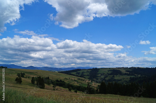 Panoramic view of the Carpathian mountains covered by a green forest under a blue sky and white clouds