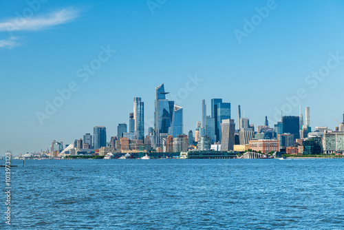 Panoramic view of the Manhattan skyline from Hoboken, New Jersey, set against a clear blue sky.