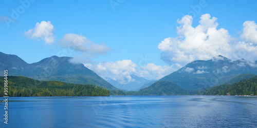 Panoramic view of the mountains around ocean bay near Bamfield in Canada.
