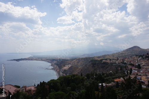 Panoramic view of the Sicilian coast, the bay of Giardini Naxos, and the majestic Mount Etna volcano, seen from Taormina, Italy