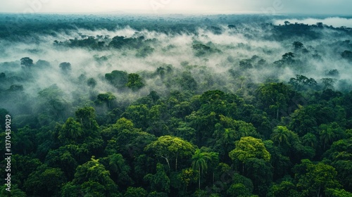 Panoramic view of the vibrant Amazon rainforest shrouded in ethereal mist