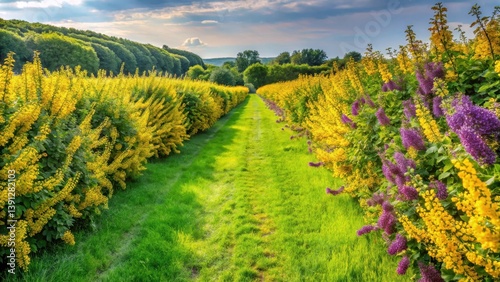 Panoramic view of vibrant yellow and purple currant bushes growing in rows amidst a sea of lush green grass, currant seeds