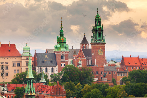 Panoramic view of Wawel Castle from clock tower in the main Market Square, Cracow, Poland. Aerial view