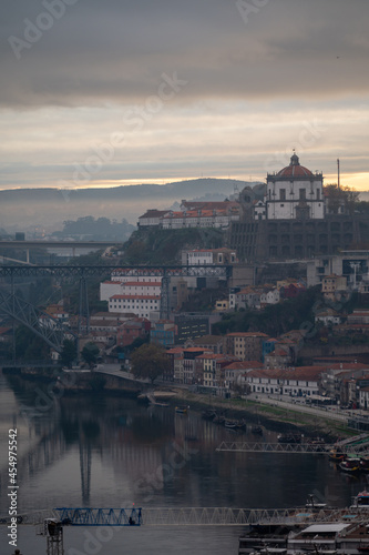 Panoramic view on Douro river and old part of Porto city in Portugal at cloudy sunrise