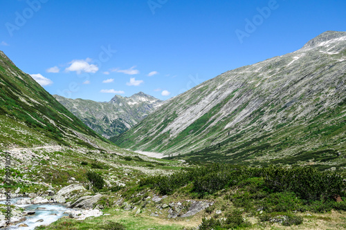 Panoramic view on huge glacier in Maltal region in Austrian Alps. The valley below it flourishing with green and freshness., small torrent in the middle. Summer in the mountains. Serenity and solitude