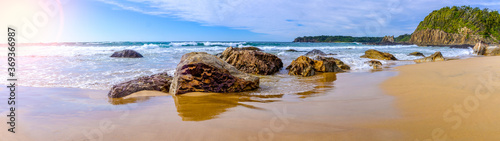 travel, panorama, seascape, australia, nsw, australian, beach, beach, blue skies, landscape, morning, nature, new south wales, ocean, pacific, recreation, relaxation, rock, sand, sandbeach, sea, sunny, surf, tour tourism, vacation, wave, wave