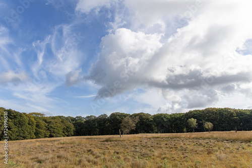 Panoramic view over some of the heathlands and woodlands of Hoge Veluwe National Park (Het Nationale Park De Hoge Veluwe) the Netherlands with dramatic white clouds in blue sky