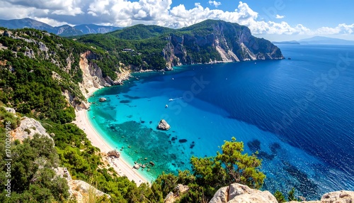 Panoramic vista of a pristine beach nestled within a dramatic coastal landscape, showcasing vibrant turquoise waters and lush green hills.